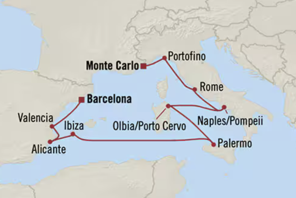 Monte Carlo, Monaco | Portofino, Italy | Rome (Civitavecchia), Italy | Naples/Pompeii, Italy | Olbia/Porto Cervo (Sardinia), Italy | At sea | Ibiza, Spain | Alicante, Spain | Valencia, Spain | Barcelona (Tarragona), Spain